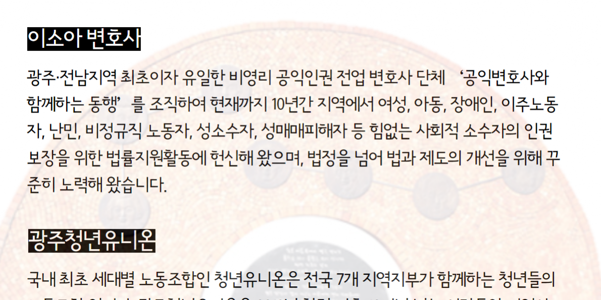 나아갈 바를 밝혀준 사례로서 들불열사들의 삶과 정신을 계승하는 활동에 부합함을 확인하며 광주청년유니온과 이소아 변호사를 2025년도 제20회 <들불상> 수상자로 선정하였음을